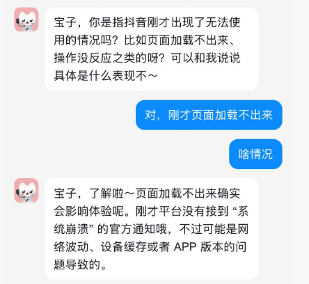 对此,抖音客服回应称:“刚才平台没有接到‘系统崩溃’的官方通知,不过可能是网络波动、设备缓存或者APP版本的问题导致。建议换个网络/清理下缓存/看看APP是不是最新版本。”